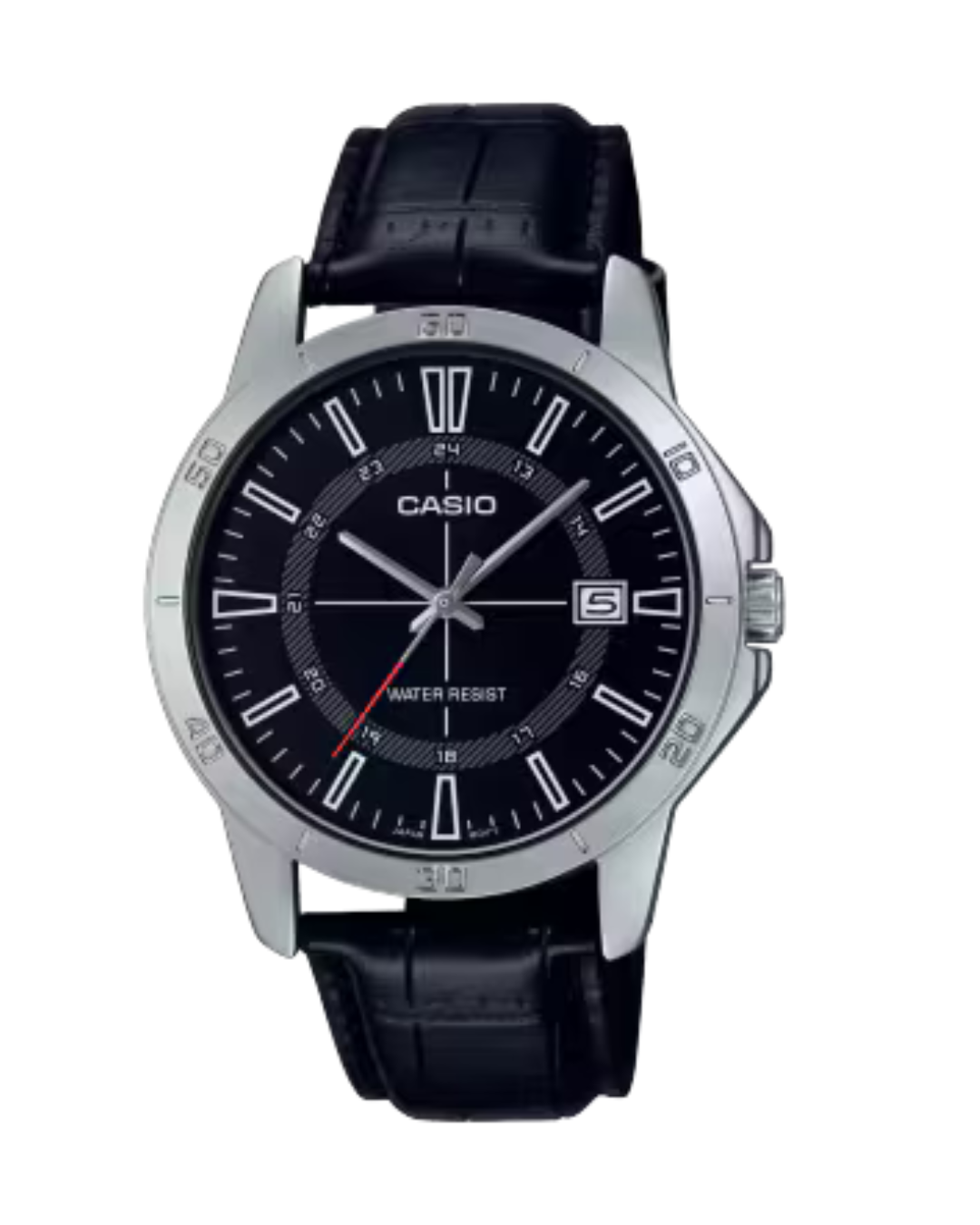 The Casio MTP-V004L-1CU is a sophisticated men’s watch crafted for those who value style and reliability. Its sleek stainless steel case paired with a genuine leather band provides a refined appearance that complements any outfit. The BLACK dial with bold markers ensures easy readability, while the date function adds practical convenience for daily use.