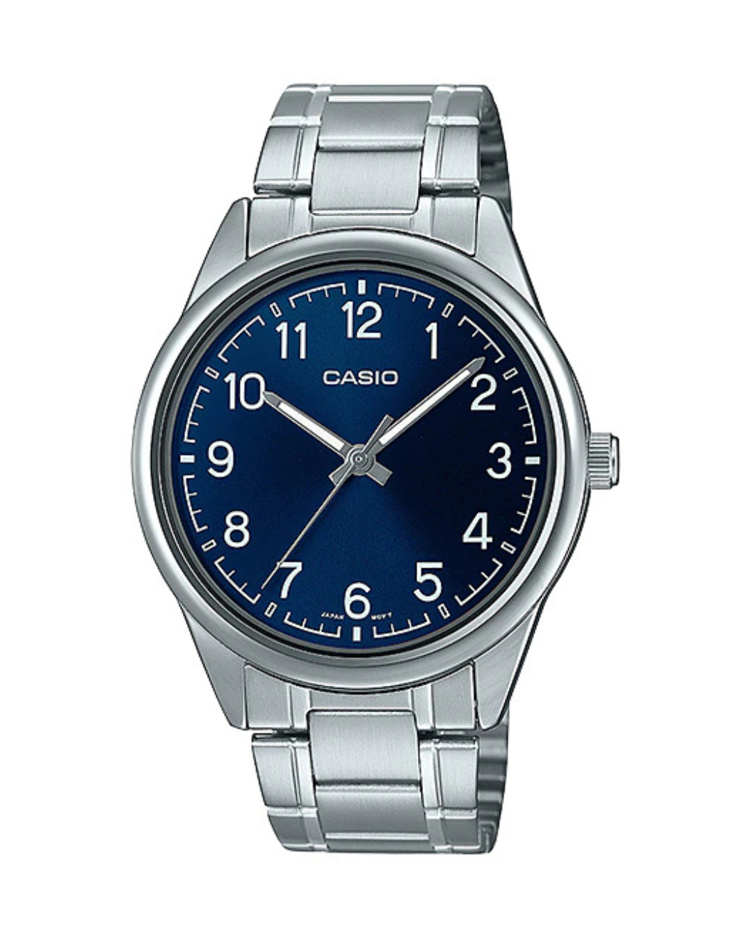 The Casio MTP-V005D-2B4UDF is a classic men’s analog watch featuring a stainless steel bracelet, precise quartz movement, and a clean blue dial design, perfect for everyday and business wear.