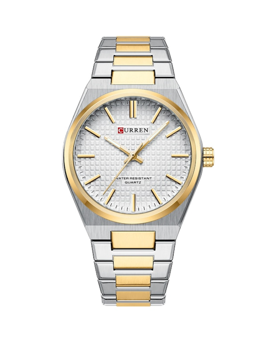 The CURREN 8439 is a distinguished men’s wristwatch crafted for those who appreciate refined style. It showcases a white dial encased in a sturdy 40mm alloy case and is complemented by a two-tone stainless steel bracelet that elevates both formal and casual outfits. With a case thickness of 11mm and a comfortable 22mm wide band, this timepiece ensures both durability and wrist presence. The band is fully adjustable for a perfect fit. Housed in an official CURREN box, it makes an excellent gift choice or addition to any gentleman’s watch collection.