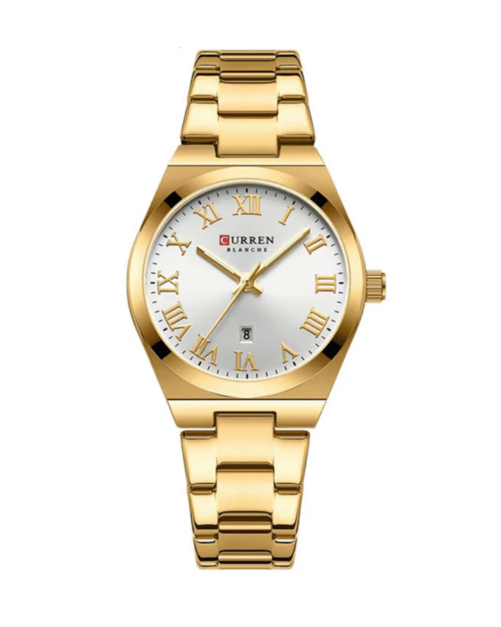 The CURREN 9095 Women’s Wrist Watch blends sophistication and everyday practicality. Featuring a white dial housed in a 33mm gold-toned stainless steel case, this timepiece radiates timeless charm. Its 15mm wide band and 10mm case thickness ensure a delicate fit on the wrist, while the 220mm strap length and lightweight 72g build add comfort and wearability. Ideal for both formal and casual settings, this golden edition of the 9095 comes complete with an original CURREN box, making it a stylish gift option or a chic addition to your personal collection.