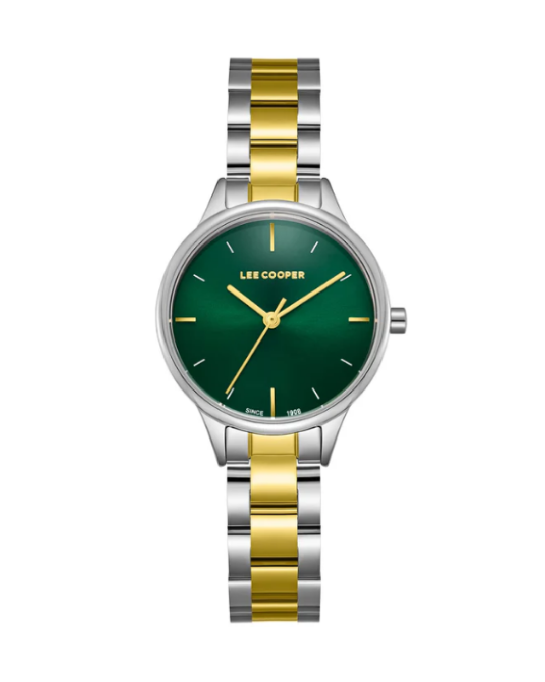 The Lee Cooper LC08080.270 is a beautifully designed ladies wristwatch that combines modern elegance with everyday practicality. The watch features a compact 30mm round SuperMetal case, plated in a sleek silver tone, paired with a stylish silver and gold metal bracelet that adds a hint of luxury to any outfit. The rich dark green dial stands out with its refined simplicity and is protected by durable mineral glass. Powered by a reliable 3-hand quartz movement, this watch ensures accurate timekeeping with minimal maintenance. With a water resistance rating of 3 ATM, it’s suitable for everyday use including handwashing and light splashes. Whether you’re heading to the office or dressing up for an event, this Lee Cooper timepiece adds a graceful finish to your ensemble. Includes a 2-year international warranty for peace of mind.