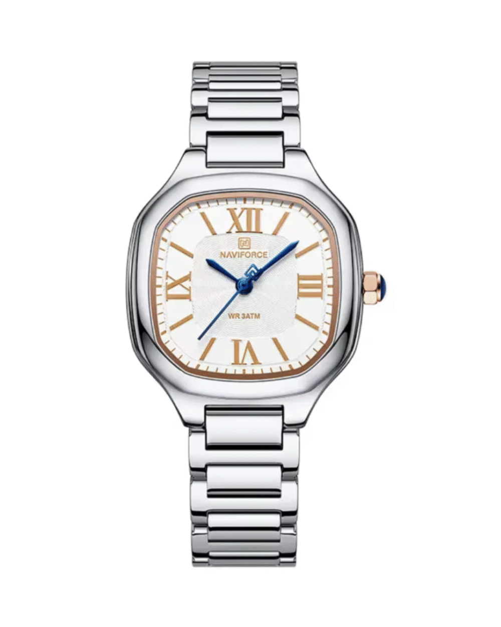 The NAVIFORCE NF5042 is an elegant timepiece crafted for women who appreciate both style and function. With a minimalist square case made from durable alloy, paired with a clean white dial featuring Roman numeral markers, it offers a classic yet modern aesthetic.