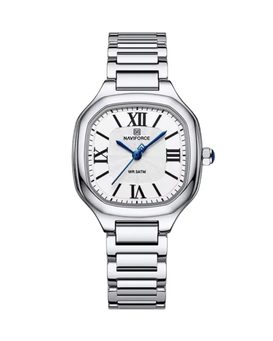 The NAVIFORCE NF5042 is a refined wristwatch designed for the modern woman who values simplicity and sophistication. Its square 31mm case is crafted from durable alloy with a polished silver finish, housing a bright white dial accentuated by timeless Roman numeral markers. The sleek stainless steel band with a push-button hidden clasp offers a secure and stylish fit.