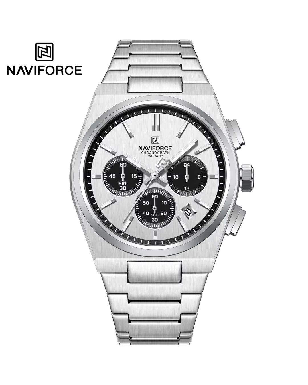 NAVIFORCE NF8048 is a stainless steel quartz chronograph watch with a 40mm round dial, complete calendar, and 3ATM water resistance—combining everyday function with refined style.