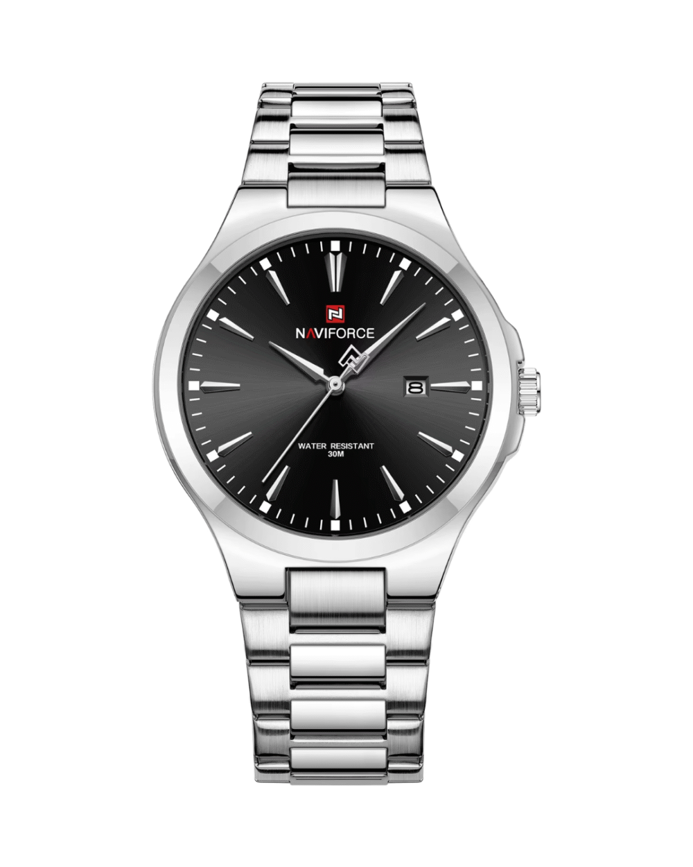 Step into timeless sophistication with the Naviforce NF9214 Men’s Wristwatch in Silver and Black. Designed to complement both formal and casual looks, this quartz-powered timepiece showcases a crisp black dial encased in a durable alloy body with a polished silver-tone stainless steel strap.