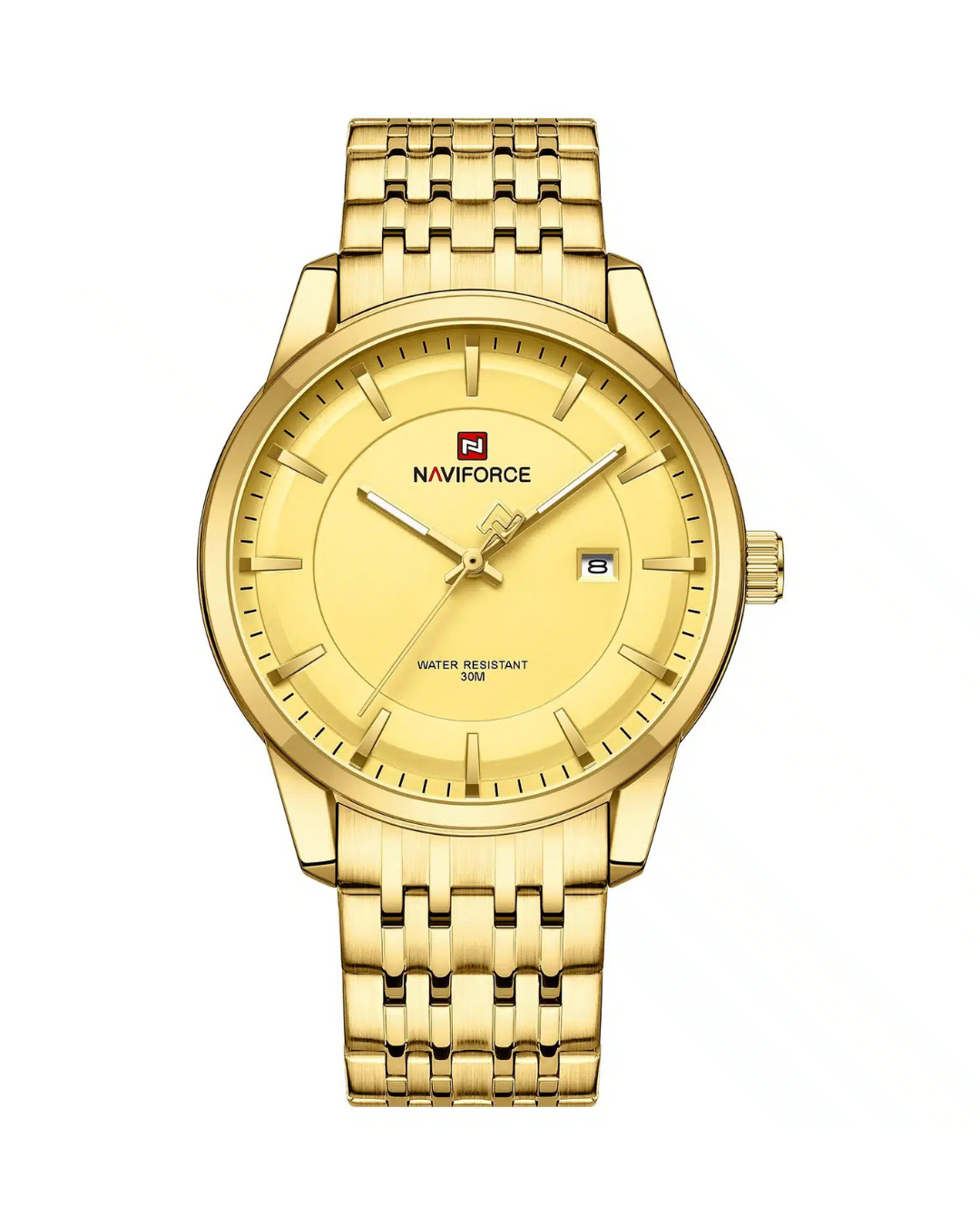 The NaviForce NF9228 blends bold aesthetics with dependable functionality, making it a distinguished choice for men who appreciate sleek design and everyday performance. Encased in a polished golden zinc alloy body with a matching stainless steel bracelet, this watch delivers both elegance and durability.