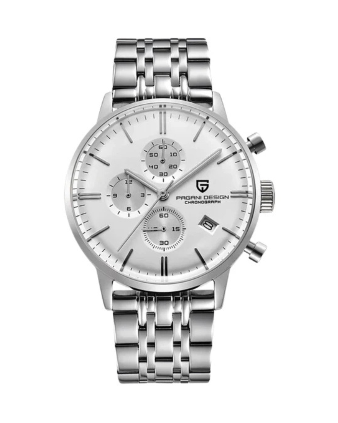 Experience refined functionality with the Pagani Design PD2720K Chronograph Watch. Built with a durable stainless steel case and bracelet, this watch features a striking black dial enhanced by chronograph sub-dials, providing accurate stopwatch functionality and date display.