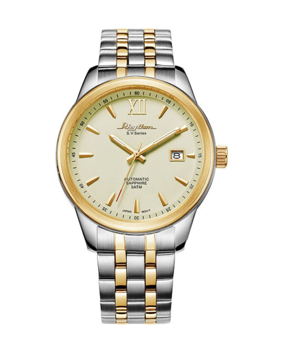 The Rhythm AS1611S05 Men’s Automatic Dress Watch combines timeless elegance with precision engineering. This stylish timepiece features a 42mm stainless steel case, paired with a sleek stainless steel-gold band that adds a touch of luxury to your look. The watch’s ivory dial, protected by scratch-resistant sapphire glass, offers excellent visibility while maintaining durability over time.