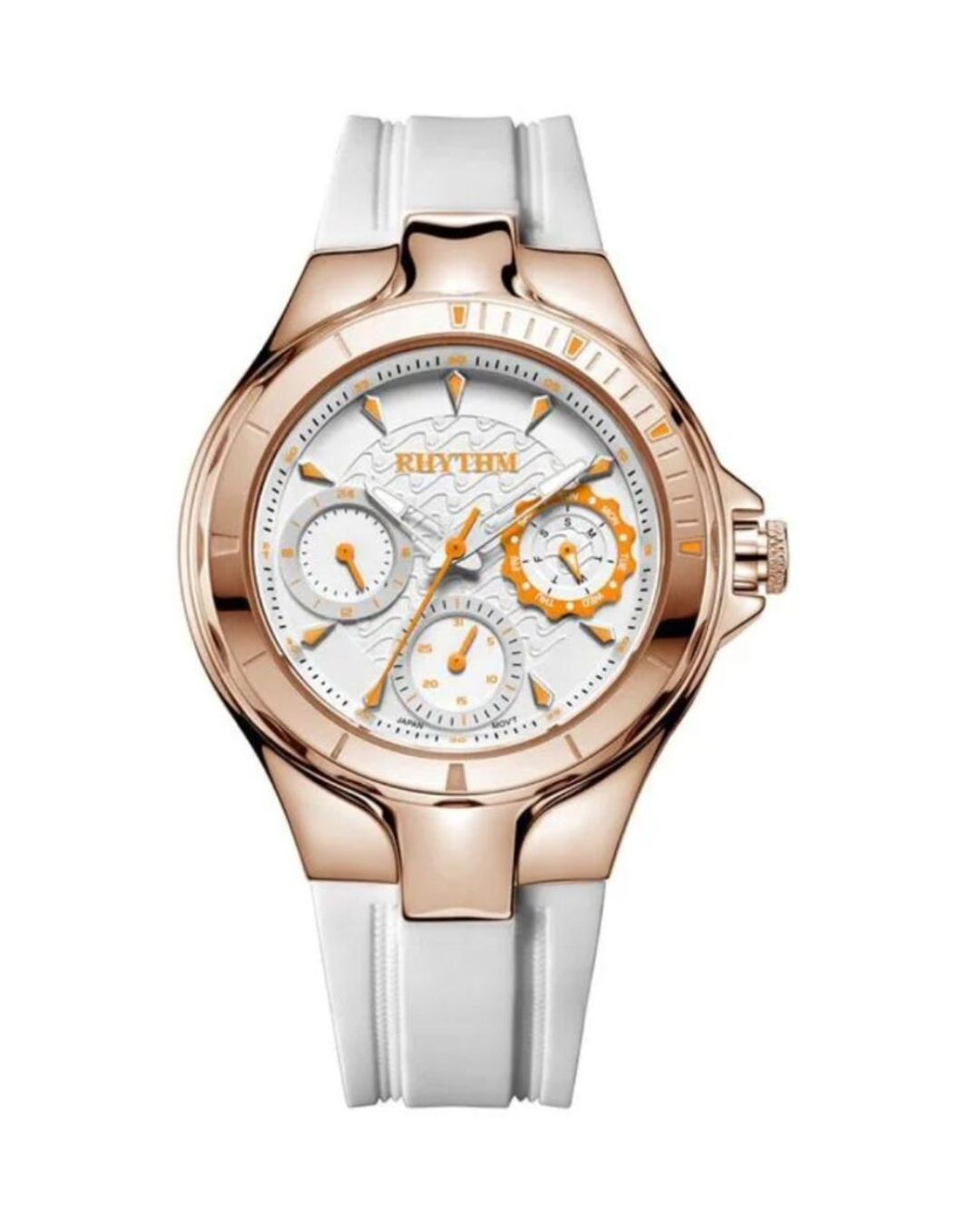 The Rhythm F1504R04 Women’s Analog Watch exudes both style and functionality. Designed with a stainless steel case and a comfortable silicone strap, it features a white dial with numeral indexes and three chronograph sub-dials at the center, providing a sophisticated, sporty look.